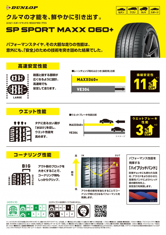 いつもタイヤセレクト泉北店をご利用有り難うございます♪ 当店おすすめ商品のご案内です♪ 高速安定性能とウエット性能に優れたプレミアムタイヤ [SP SPORT MAXX 060+]です。 ダンロップの技術が満載のタイヤです。 路...