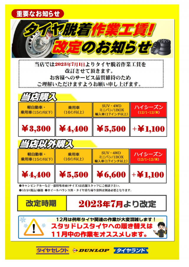 いつもタイヤセレクト泉北店をご利用有り難うございます♪ 以前にもご案内いたしましたが、 2023年7月1日より、スタッドレスタイヤ(ホイール付)への 脱着作業工賃を値上げさせて頂いております。 他店購入品につきまし...