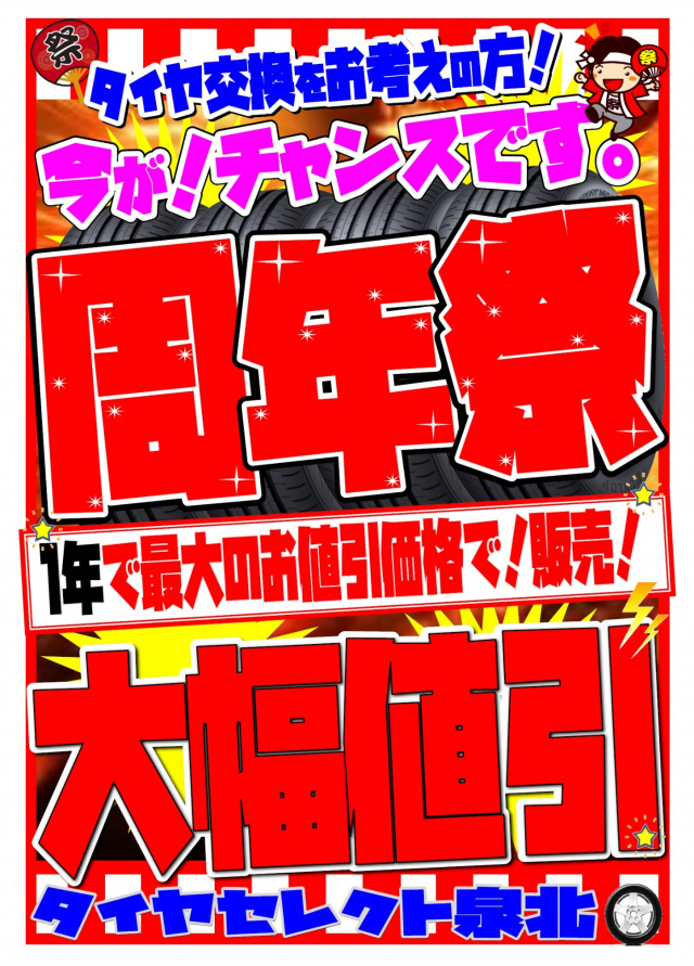 いつもタイヤセレクト泉北店のご利用ありがとうございます(^^) 11月に入り今年もいよいよ残り2ヶ月になりました。 タイヤセレクト泉北では 年に1度のお祭セール【周年祭】を開催中です。 セール期間は11月19日(日)まで...