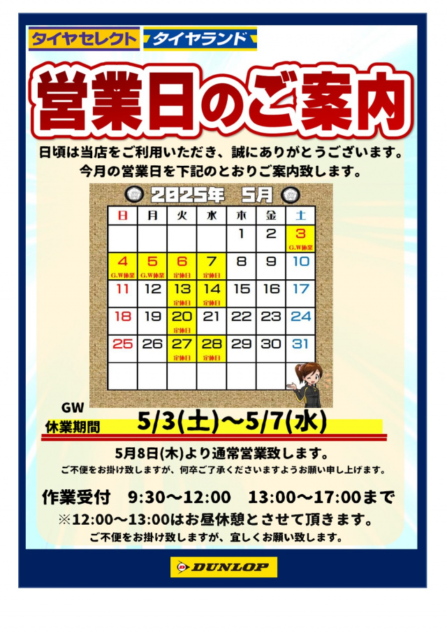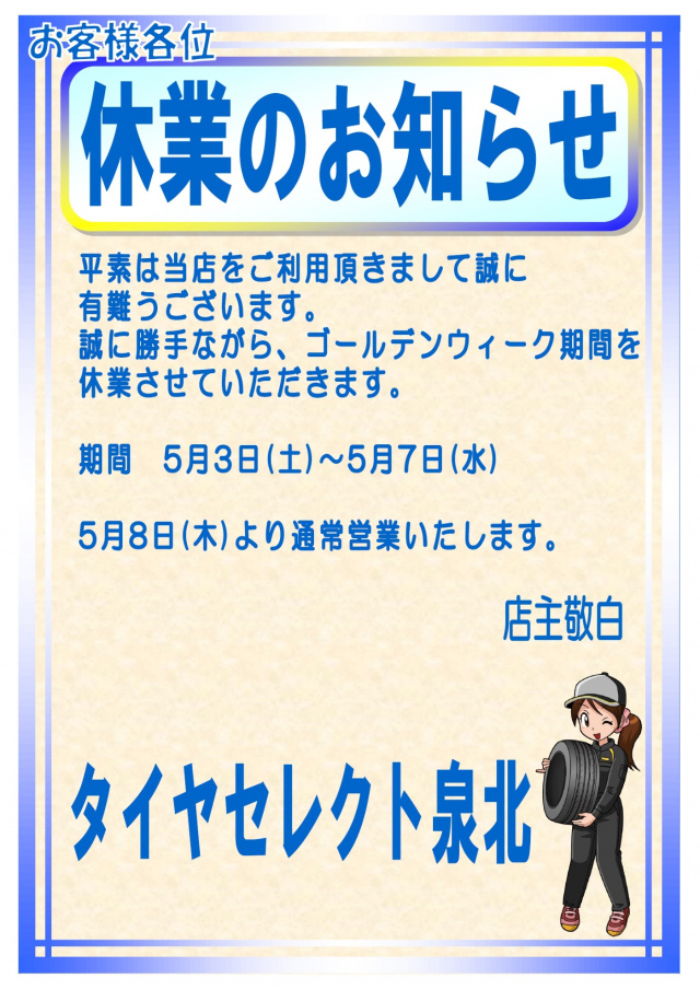 いつもタイヤセレクト泉北店をご利用有り難うございます♪ ゴールデンウィーク期間の休業日のご案内になります。 お間違えのないようご来店お待ちしております♬