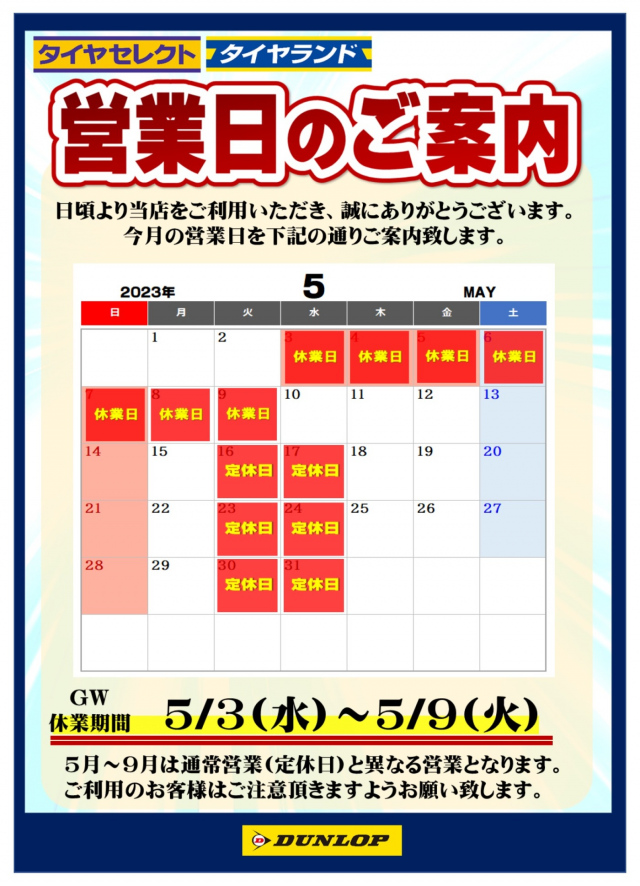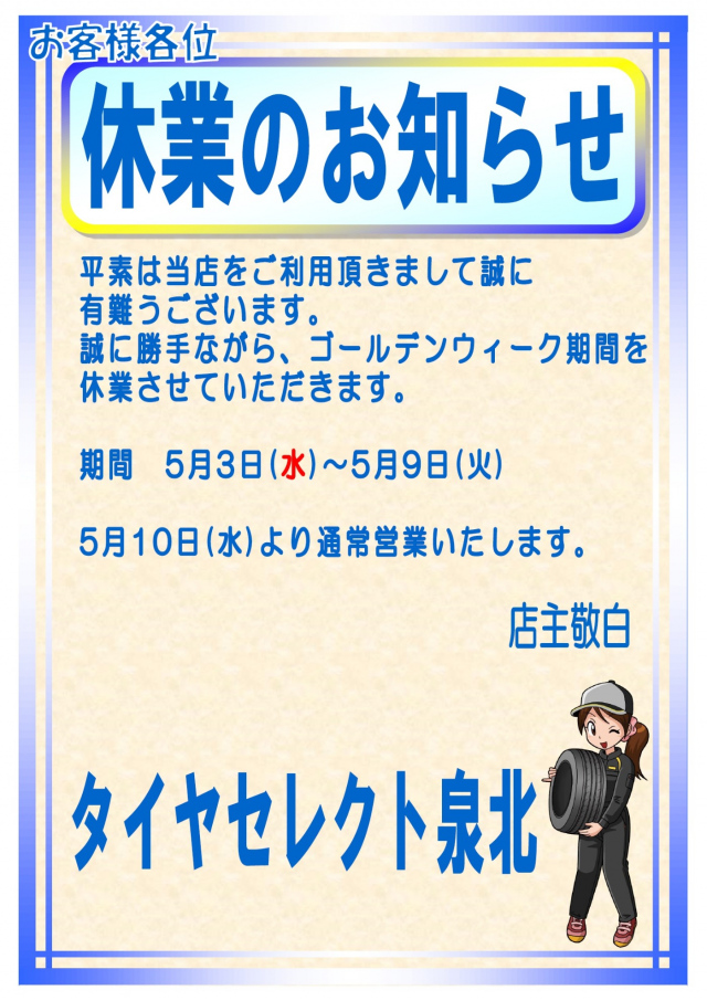 いつもタイヤセレクト泉北店をご利用有り難うございます♪ ゴールデンウイーク期間の定休日及び休業日を掲載しております。 お間違えの無いようご来店お待ちしております♬
