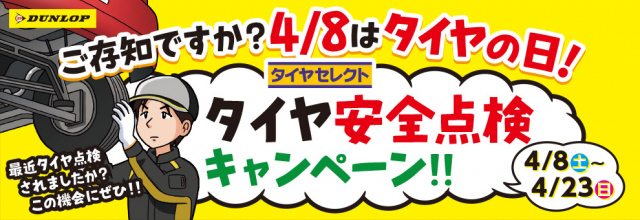 いつもタイヤセレクト泉北店をご利用有り難うございます♪ ご存じの方もいらっしゃると思いますが 本日4月8日は「タイヤの日」なんです!(^^) タイヤセレクト泉北店では 無料タイヤ安全点検を実施中です♪ 近頃、タイヤ点...