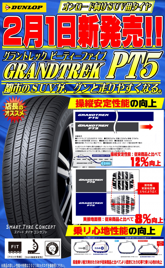いつもタイヤセレクト泉北店をご利用有り難うございます♪ まだまだ寒い日が続く今日この頃ですが 2023年新商品発売のご案内になります。 本日より待望の新商品:オンロード向けSUV用タイヤ グラントレックPT5が発売...