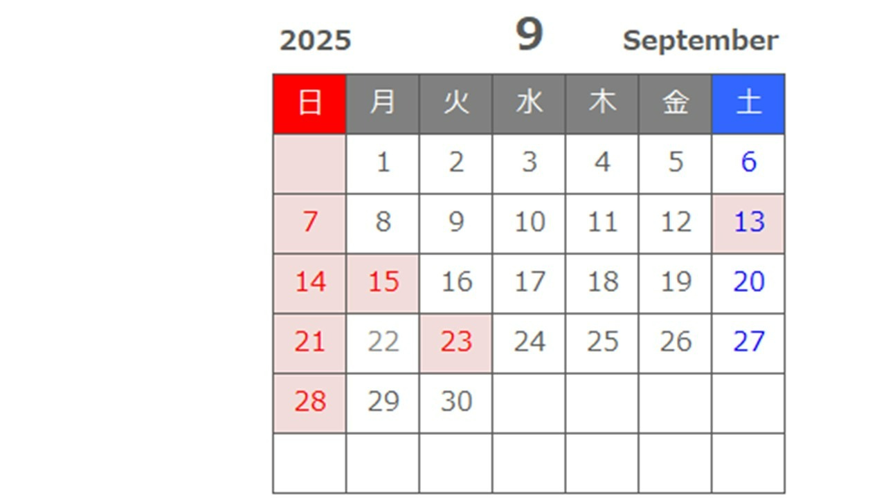 9月の定休日のお知らせ