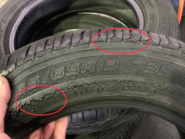 この状態で走行すると、燃費の悪化、クッション性も悪く、ヒビ割れしている所から水が入り中のワイヤが錆びてバーストの要因にもなります。