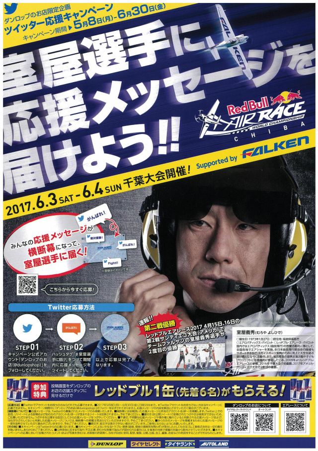 6月に千葉で開催される、レッドブルエアーレースにファルケンチームに所属して参加している室屋選手にツイッターで応援メッセージをつぶやくと、応援メッセージが横断幕として室屋選手に届きます!!