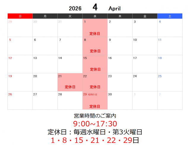 いつもタイヤセレクト広島観音HPをご覧頂き、誠にありがとうございます m(_ _)m 2026年4月営業日・営業時間のお知らせです。 定休日は毎週水曜日・第3火曜日となります。 営業時間は9:00~17:30となっております。 そ...
