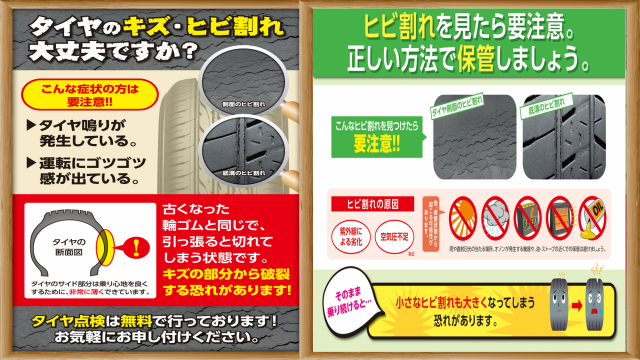 ・タイヤつや出し剤等には、ひび割れが発生する等タイヤに有害なものもありますので