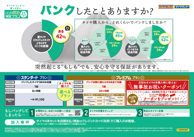 ダンロップ直営店独自の『パンク安心保証プレミアム』にご加入していただいていたので、