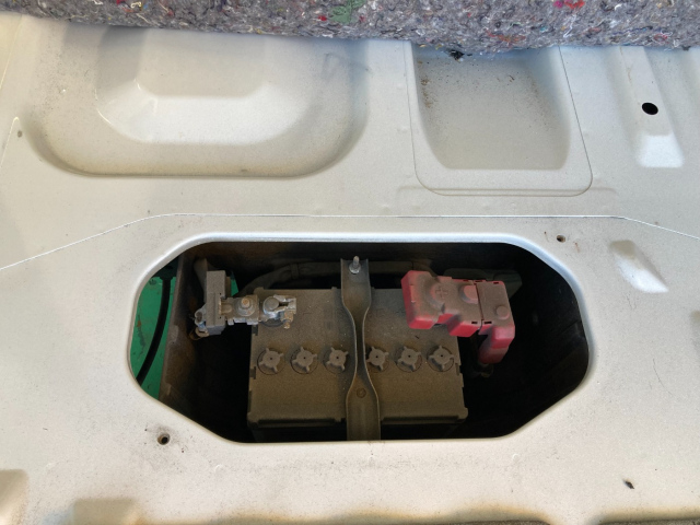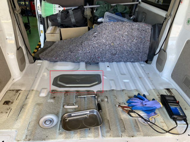 ばってりーの場所は荷室の下、2枚目の写真の赤で囲んだ銀色のフタの下です。