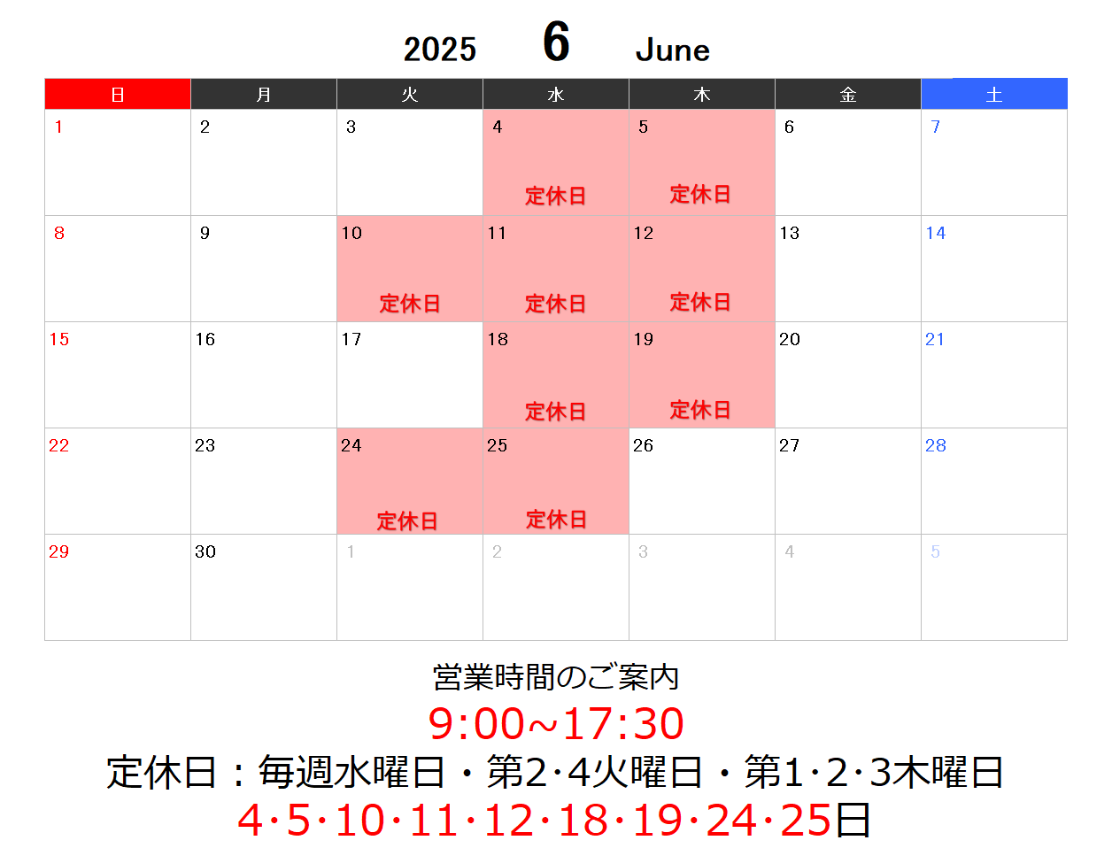定休日は毎週水曜日と第2・4火曜日・第1・2・3火曜日となります。