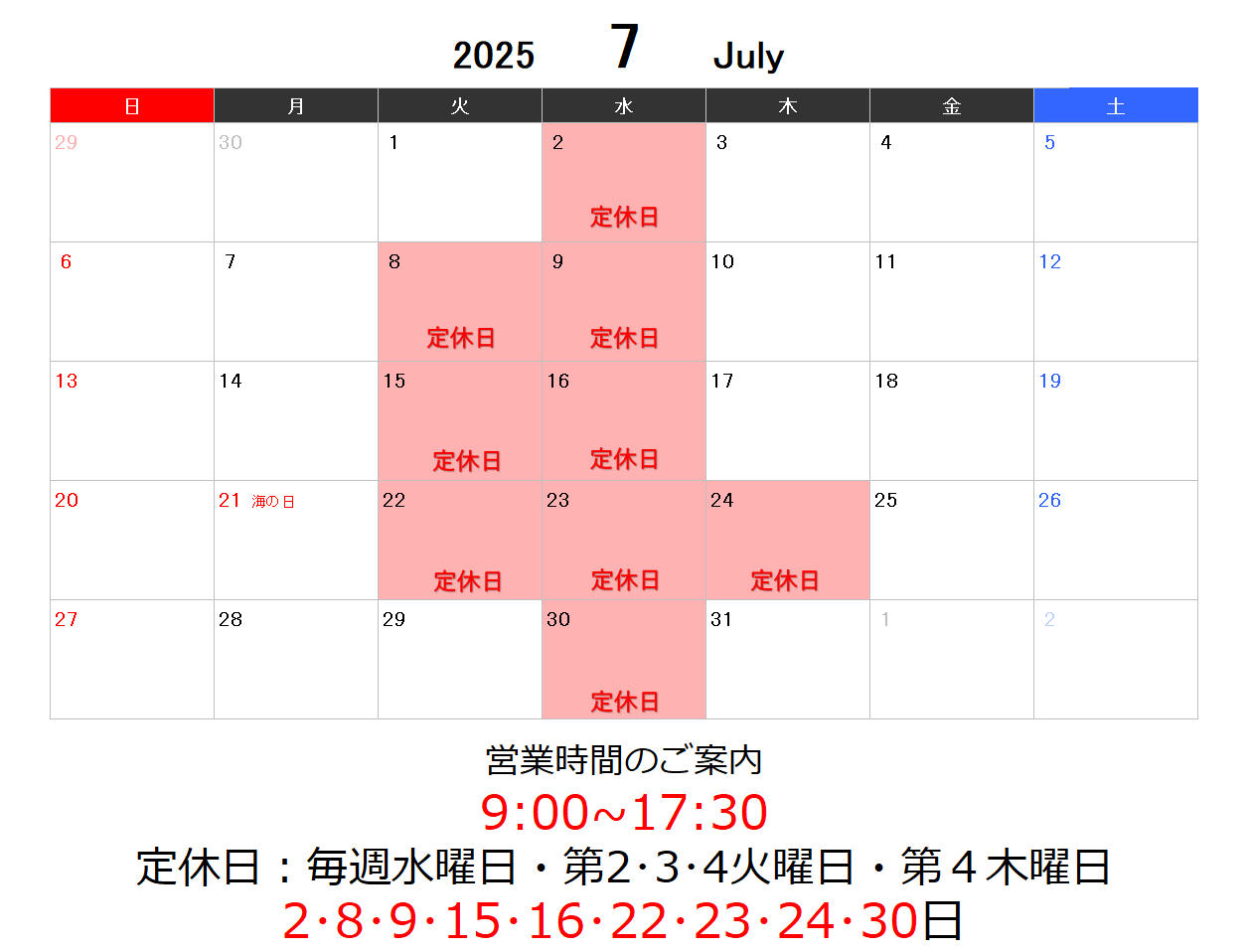 定休日は毎週水曜日と第2・3・4火曜日・第4木曜日となります。