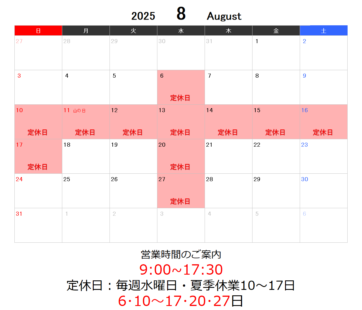 定休日は毎週水曜日と夏季休業10~17日となります。
