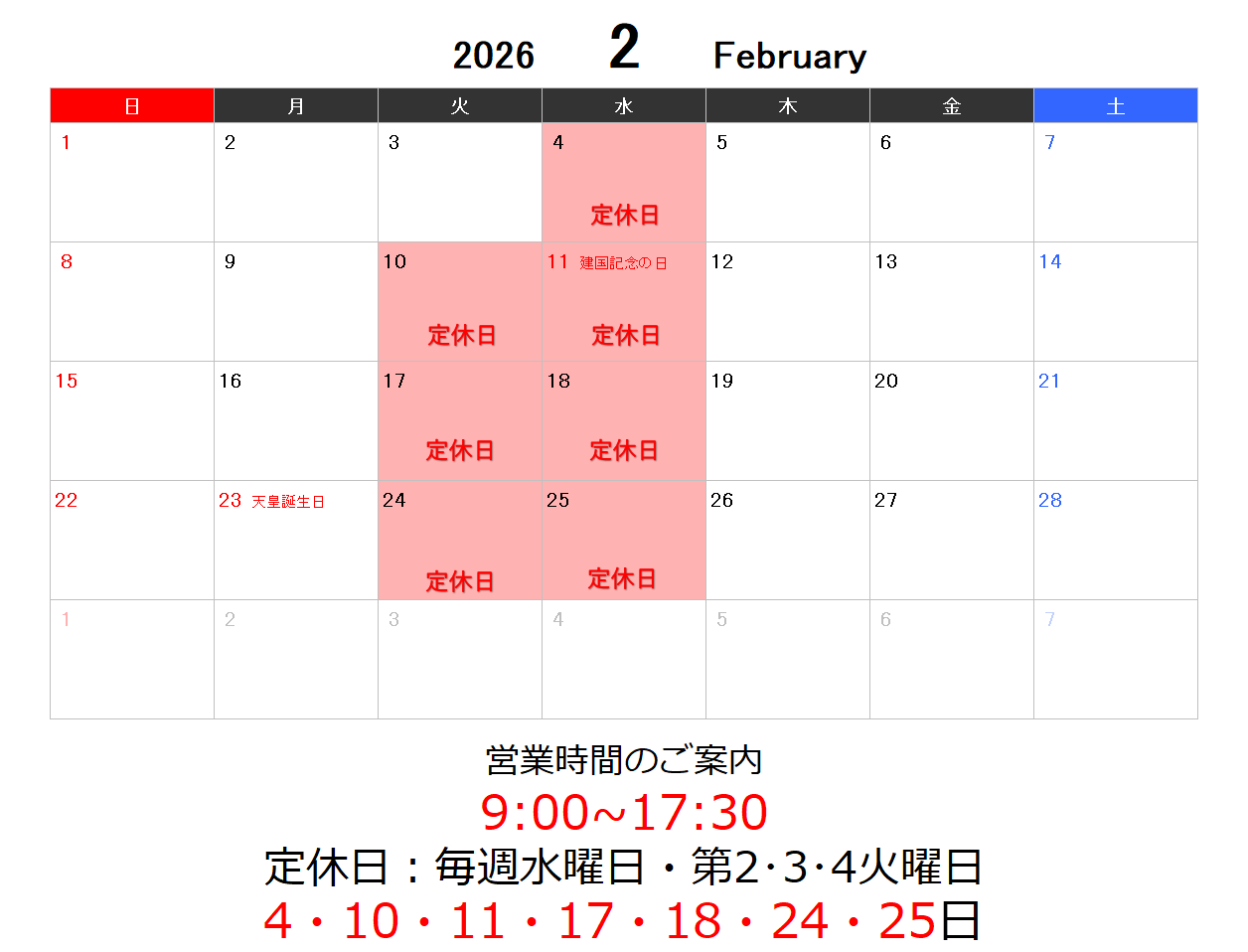 2026年2月営業日・営業時間のお知らせです。