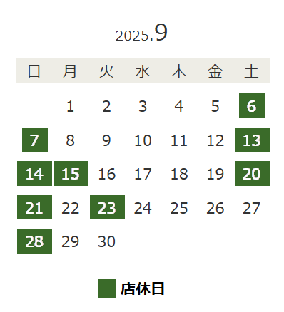 以上が、9月の店休日となります。
