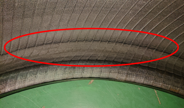 タイヤの内部には、空気圧が低くく走行した為に、シワができており非常に危険な状態でした。