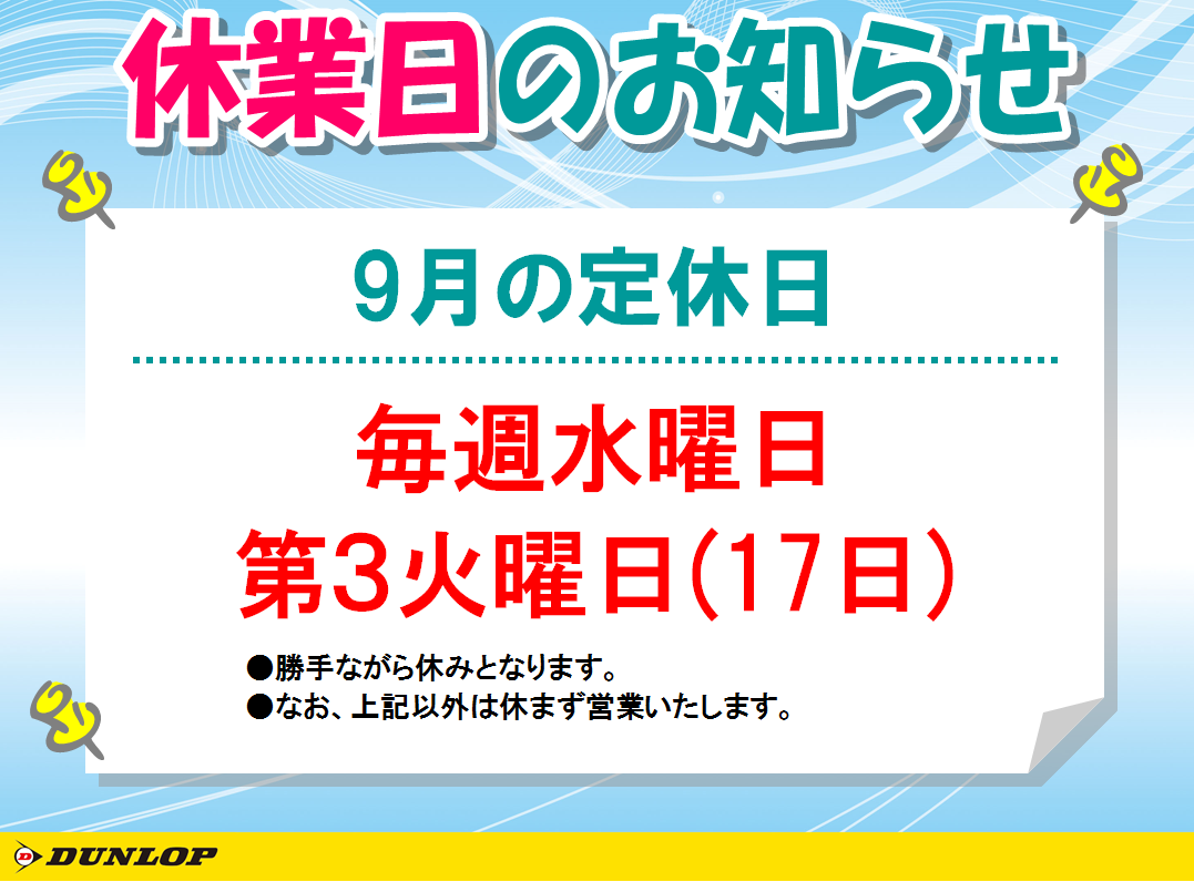 9月の定休日のお知らせ 本日は、タイヤセレクトかすみHPをご覧頂き誠にありがとうございます。 9月の定休日のお知らせです。 毎週水曜日と第3火曜日(17日)が定休日となります。 上記以外は、休まず営業致しますので皆様のご来店お待ちしております。 2019.08.30