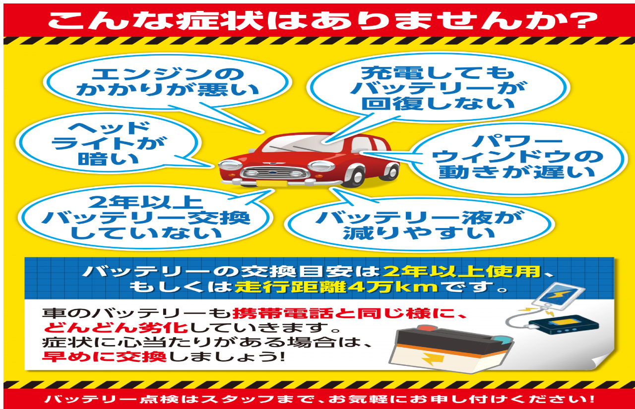 突然バッテリーがあがりエンジンがかからなくなる前に定期的に点検をおススメします!