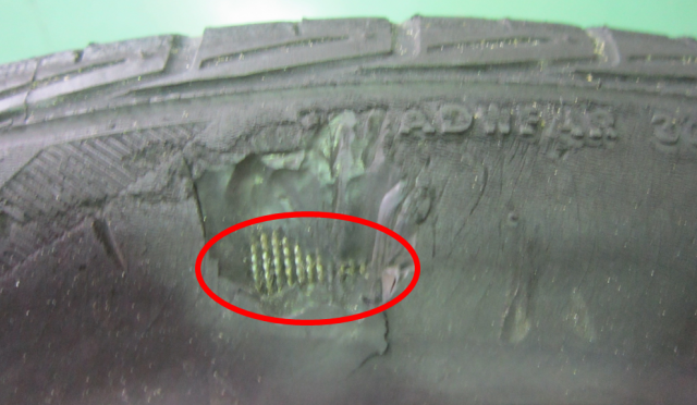タイヤの側面をぶつけたことにより、タイヤの内側の骨組み(タイヤの骨格を形成する部材)が見えています。人間でいうと、肋骨が見えているようなものです。