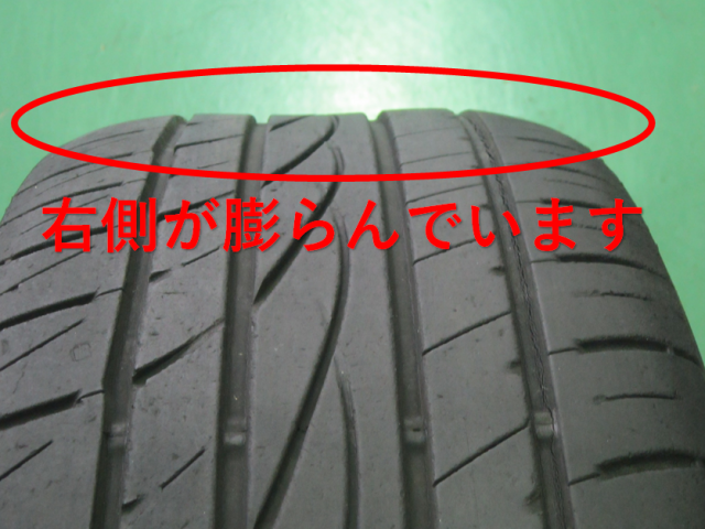 パンク修理が原因とみられる、タイヤ内部の剥離(はくり)が、このようなタイヤの症状になっています。