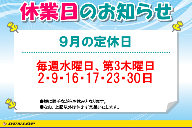 9月の定休日をお知らせいたします。
