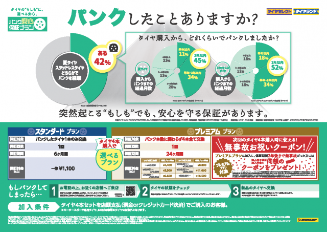 日頃より、タイヤセレクトかすみHPをご覧頂き誠にありがとうございます。 今日はパンク安心保証プランのご案内です(^_^.) タイヤセレクトかすみでタイヤ4本セットご購入時に、パンク保証(プレミアムプラン)への加入を...