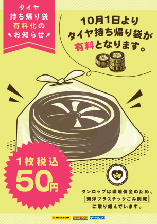 日頃より、タイヤセレクトかすみHPをご覧頂き誠にありがとうございます。 突然のご案内となりますが、 今シーズンより”タイヤ持ち帰り袋”を『有料:¥50/枚税込』とさせて頂きます。 『夏→冬・冬→夏』タイヤへ履き替え...