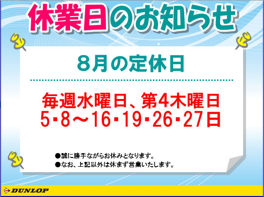 日頃より、タイヤセレクトかすみHPをご覧頂き誠にありがとうございます(^○^) 8月の定休日をお知らせいたします。 来月は、毎週水曜日と第4木曜日がお休みとなります。 お盆休みは8日~16日となります。 8月は...