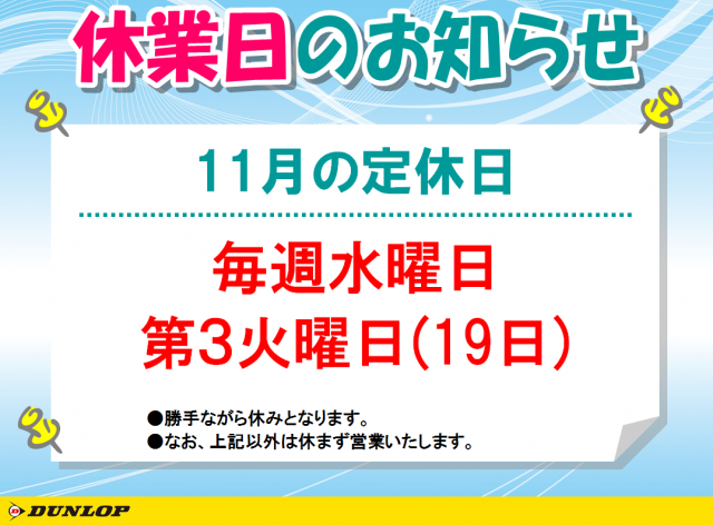 本日は、タイヤセレクトかすみHPをご覧頂き誠にありがとうございます。 11月の定休日をおしらせいたします。 定休日は毎週水曜日と第3火曜日(19日)となっております。 上記以外は休まず営業致します!! ≪10/29の...