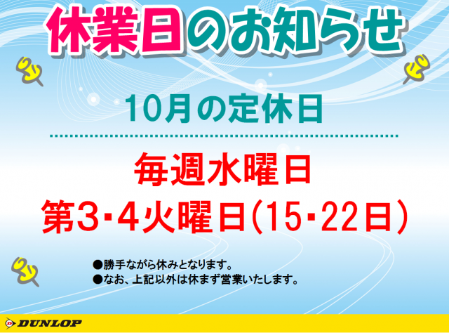 本日は、タイヤセレクトかすみHPをご覧頂き誠にありがとうございます。 10月の定休日のお知らせをします。 毎週水曜日と第3・4火曜日(15・22日)が定休日となります。