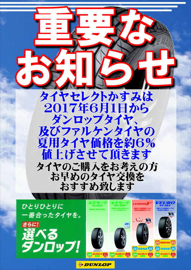 本日は、タイヤセレクトかすみHPをご覧頂き誠にありがとうございます。 タイヤ価格が6月1日より値上がり致します。 タイヤ購入をご検討されています方は、今月中のタイヤ交換をおすすめ致します。