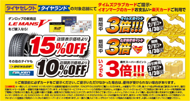 本日は、タイヤセレクトかすみHPをご覧頂き誠にありがとうございます。 始まってま~す。 タイムズカード、イオンカード、楽天カードをお持ちの方は必見です! 上記のカードのご提示で、ダンロップ・ファルケンブラ...