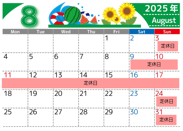 日頃より、タイヤランド尾道HPをご覧いただき、ありがとうございます。 8月の定休日のご案内をいたします。