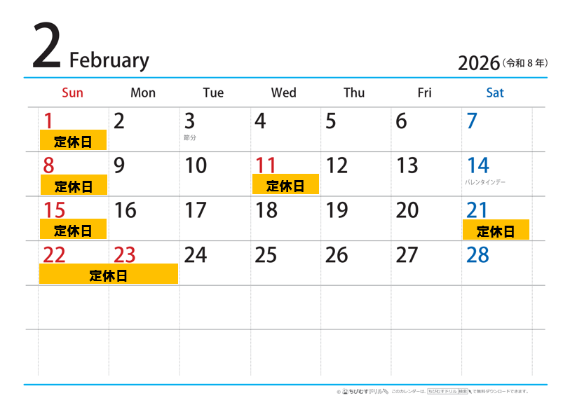 日頃より、タイヤランド尾道HPをご覧いただき、ありがとうございます。 2月の定休日のご案内をいたします。