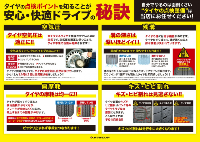 タイヤ交換後は100kmの走行を目安に、また当店にお立ち寄りください。