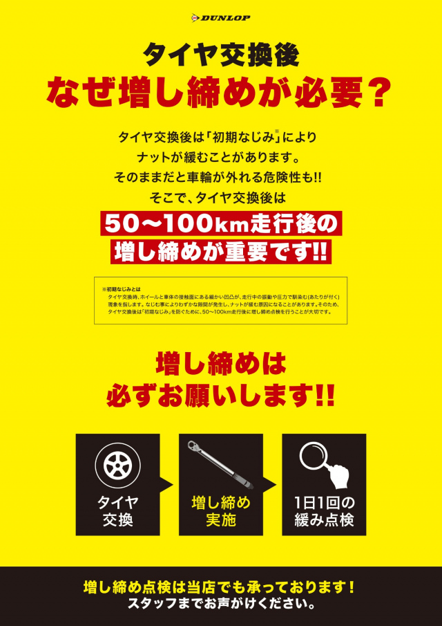 タイヤ交換後は100kmの走行を目安に、また当店にお立ち寄りください。