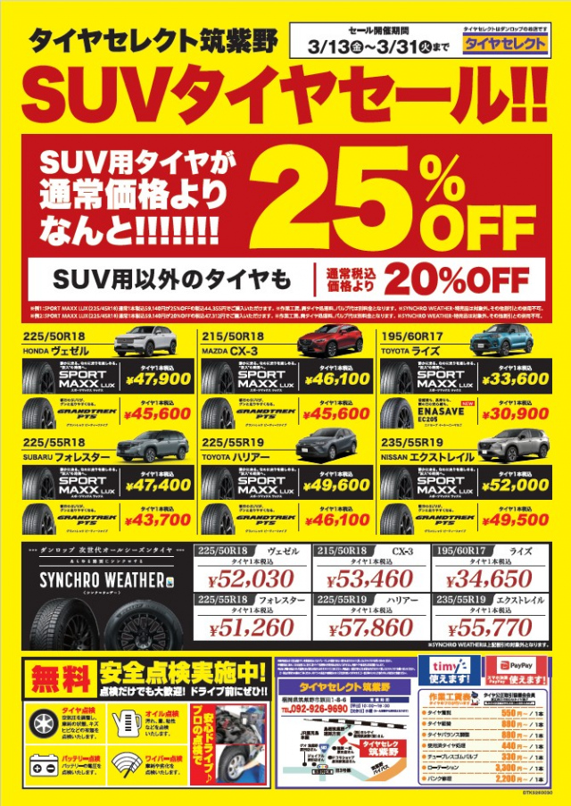 大好評のSUVタイヤセール! 3月13日(金)から3月31日(火)の期間開催いたします(^^)/ 最近のSUVはタイヤのインチも大きくなり、お財布にやさしくない・・・・???? だからこそこのお買い得な期間に交換おススメし...