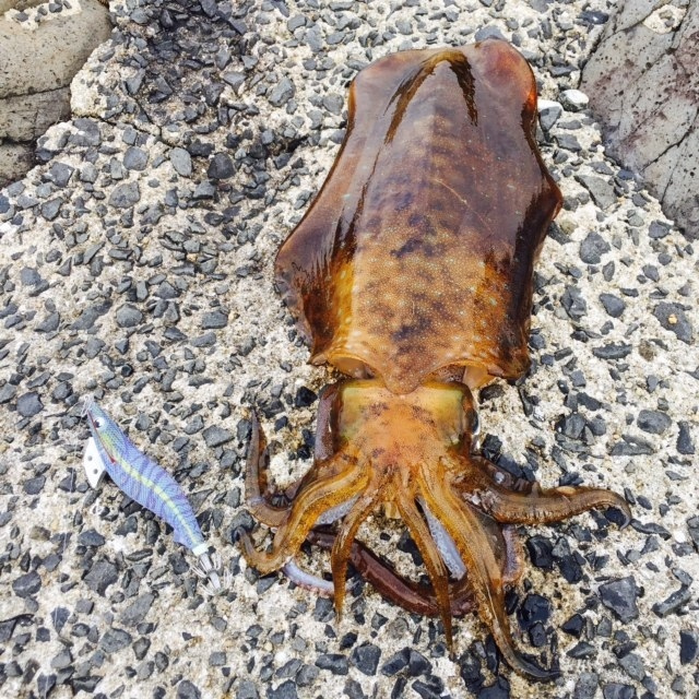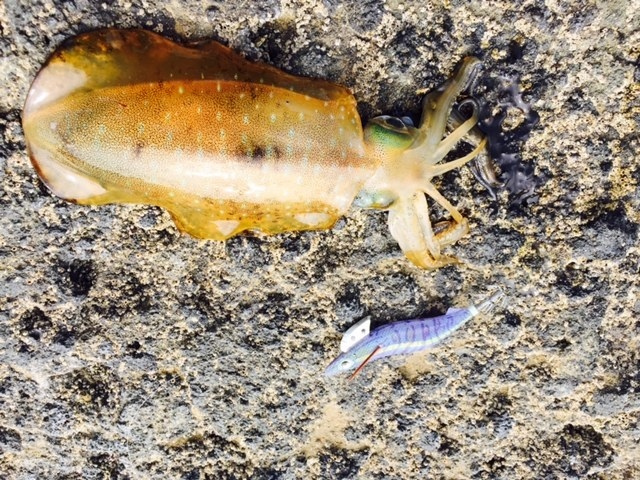 夜中出発し早朝のアオリを狙いに平戸の端までいきましたが、日の出と共に何本かあがったみたいで、新しい墨跡ばかり、それから満潮に向けて三つ漁港を周り、地磯にきましたがポイントには。人がいました(>~<)