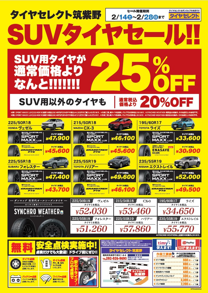内容はSUVに乗られている方、ダンロップタイヤが店頭表示から25%OFF!!!!!