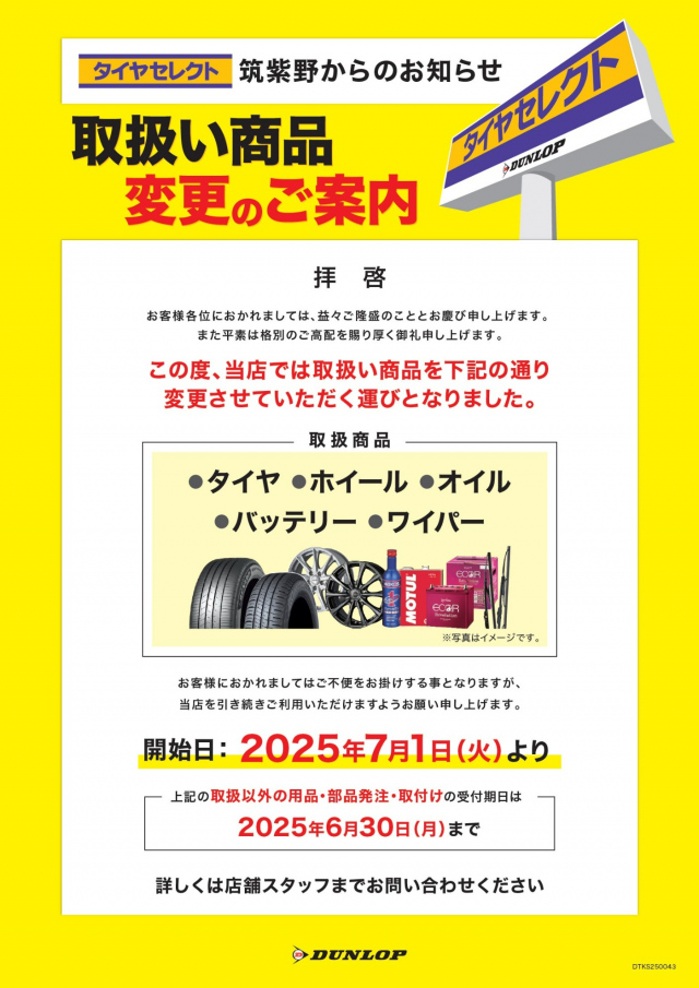 夏のセール開催中! ダンロップのタイヤを4本ご購入の方!タイヤ店頭価格から25%OFF致します!! ※特価品・シンクロウェザー除く 夏の連休前にしっかり愛車のメンテナンスをして安心ドライブしませんか? お待ちして...