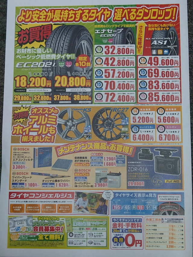 今回の目玉はタイヤ4本購入で 3種類の中から1種類お選びいただける豪華賞品を
