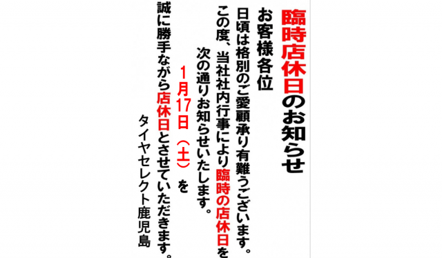 誠に勝手ながら、1月17日土曜日を社内行事開催の為、休業とさせて頂きます。 何かと御迷惑、並びにご不便をお掛け致しますが、何卒ご了承くださいますようお願い致します
