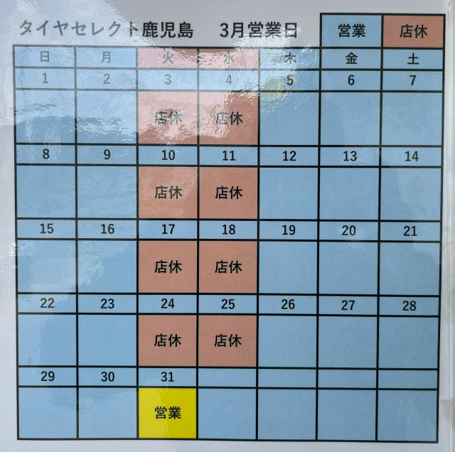 今回のお知らせは3月の営業日のお知らせです。 火曜日、水曜日は通常は店休日となっておりますが 月末の火曜日(31日)は通常営業致します。 何卒、宜しくお願い致します。