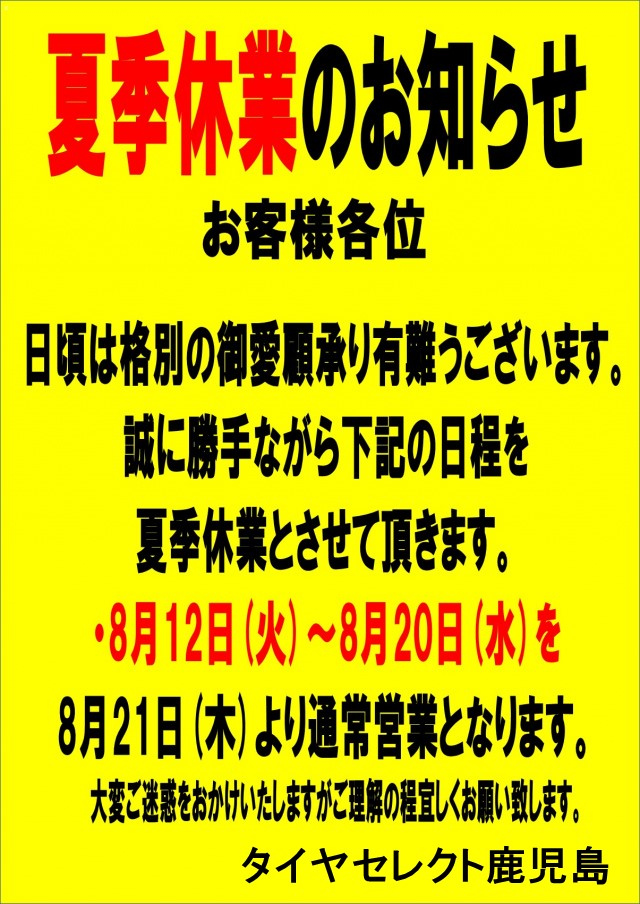 タイヤセレクト鹿児島限定セール実施します!!! お盆前のサマーセールをタイヤセレクト鹿児島限定で実施する予定です。(*´ω`) 今回は、なんとダンロップタイヤ、ファルケンタイヤ共に25%OFFとなっております(^_-)-...